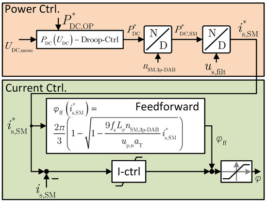 Due to the cascaded structure of the SIPO converter, each SM would have its own current control and the series connection of the SMs would require an additional balancing control scheme in real applications, as suggested in [59]. For the 3p-DAB SIPO configuration in this test bench, however, an average-value model representation of the SMs is assumed. This implies that the SMs are ideally balanced, allowing for a single current control to be applied across all DAB SMs. The power setpoint is translated into a DC current setpoint for the secondary side of the DAB SM. The current control employs the phase-shift angle , which serves as the control signal, introducing a delay for the control impulses on the secondary side, resulting in a corresponding delay of the controlled voltage relative to the primary side. The lower-level current control uses the phase-shift angle as the control signal, relying on the electrical steady-state relationships outlined in (2) and (3). They describe how the secondary output current and the resulting secondary-side DC power of one 3p-DAB SM depend on the primary and secondary SM voltages / and the phase-shift angle . The control consists of a feed-forward term and a supplementary integral controller.