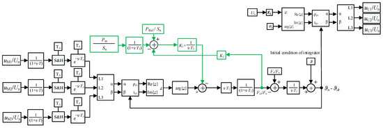 Block diagram of phase-restoring control scheme with active power control for grid-forming converter control [11].