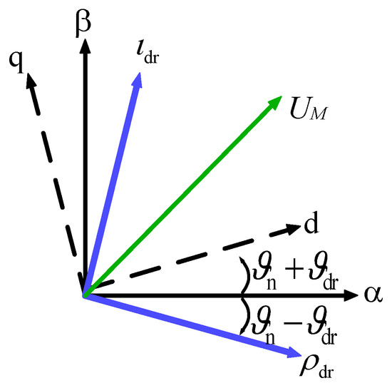 A novel control scheme called the Phase-Restoring Principle (PRP) is utilized. This control scheme inherently achieves the post-disturbance operating point directly and thus forms the grid. Figure 10 shows the block diagram of the controller. The control scheme allows for nominal frequency to be restored following a disturbance by fixing the measurement node voltage. Thus, the scheme provides the power system with an equivalent qualitative response of a SynM with large inertia. The control scheme is not based on a phase-synchronized coordinate system; rather, it transforms the phase to participate in the power exchange caused by a disturbance. Hence, it rotates in the direction opposite to the standard dq frame, as displayed in the phasor diagram of Figure 11.