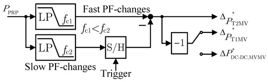 In Grid 2, the PRP-controlled converter is the only grid-forming converter and is without further measures, compensating all power fluctuations introduced through the simulated RES infeed, with the load steps performed at the Microgrid-Lab or in case of power adaptations transferred through T2MV. Depending on the power changes, the PRP converter could reach its operating limits unless additional measures are taken to partially balance the connected components. Therefore, an additional slow control, referred to here as the power-forwarding control, is added. It is a kind of slow secondary control, which dynamically adapts the power setpoints of terminal T2MV of the BESS system, as well as the terminal T1MV, with the aim to relieve the PRP converter and increase its available power range for incoming power imbalances in Grid 2. The control scheme is depicted in Figure 12. It consists of two low-pass filters with different time constants; the upper one has a larger cutoff frequency than the lower one, with lower cutoff frequency . The measured power of the PRP-controlled converter is fed as input to the filters. The task of the slower filter path is to retrieve the base loading of the PRP converter, and the upper filter path will only filter out fast power spikes. A sample-and-hold block makes it possible to freeze the current base loading at a given time point after the ramp up of the system. Changes in the power output from this base loading are then forwarded as setpoint adaptations to the other converters to change the load flow and relieve the PRP. A switch allows the power to be routed through T2MV to the BESS or to the other head-station T1MV. If the sample-and-hold block is not activated, both filters will act as a band-pass filter and forward power fluctuations in a certain frequency range.