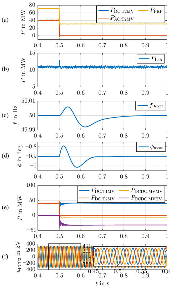 The MVDC/HVDC test system presented here is an essential part of a larger real-time test platform, the so-called Kopernikus ENSURE Co-Demonstration Platform [33]. This platform enables the integration of the MVDC/HVDC test system, or parts of it, into power system models based on real-life data, such as ENTSO-E TYNDP or Day-Ahead Congestion Forecasts data. Additionally, distributed real-time simulation via VILLASnode [34] allows for coupling different laboratories for joint simulations. The following investigations focus exclusively on the actual MVDC/HVDC test system to study the interaction of the various control systems. However, reference is made to [35], where part of the test system has been integrated into a larger transmission system model of Northern Germany.