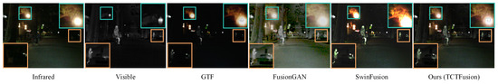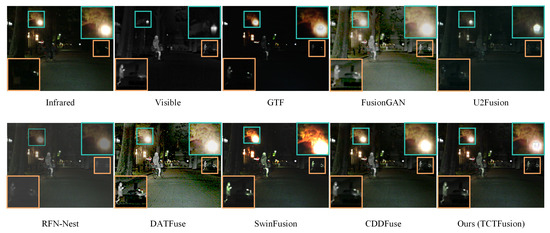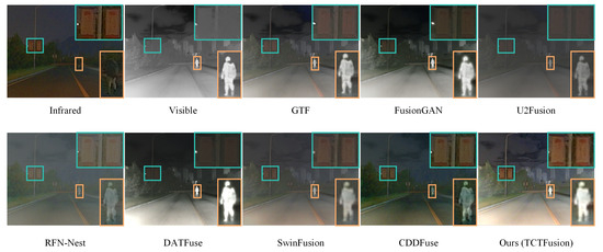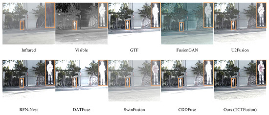 Figure 8 presents a comparison of the visual quality between TCTFusion and seven other SOTA algorithms on the M3FD test set. Under dense fog, pedestrian targets from the visible image are difficult to discern, whereas roadside billboards clearly display their color and texture. Conversely, in the infrared source image, the details of the billboards are effectively preserved, and the contours of pedestrian targets are equally clear. However, the GTF, FusionGAN, U2Fusion, and DATFuse methods neglect the texture information of billboards during the fusion process and exhibit darker colors, resulting in unnatural overall fusion effects. The U2Fusion, RFN-Nest, and SwinFusion methods perform inadequately in capturing the contours and textures of pedestrian targets, leading to a loss of detail information and reduced target recognizability. Particularly, RFN-Nest and SwinFusion fail to clearly delineate the contours of pedestrian targets in the fused images, adversely affecting the overall visual quality. In contrast, TCTFusion utilizes the FDM and IAM modules to extract and aggregate critical cross-modal information from both high-frequency and low-frequency aspects. The FDM, through parallel CNN and transformer branches, captures both modality-specific detailed features and integrates global structural information across modalities. TCTFusion suppresses noise through IAM’s group attention, which isolates infrared artifacts while blending visible textures, ensuring the comprehensive retention of color, texture, and details under the dense fog. Consequently, TCTFusion significantly outperforms other methods in color restoration, texture preservation, and detail expression, resulting in fused images with superior visual quality.