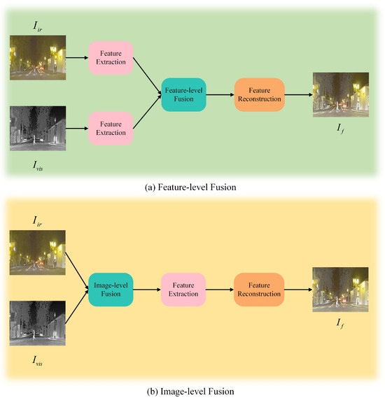 Over the past few years, the domain of Infrared–Visible Image Fusion (IVIF) has seen considerable progress, resulting in the development of a variety of fusion methodologies [11,12,13]. As illustrated in Figure 1, advanced fusion models are categorized into the following two primary types: feature-level fusion (Figure 2a) [14] and image-level fusion (Figure 2b) [15]. Feature-level fusion methods generally consist of three key steps as follows: (1) using distinct feature extraction modules to process each source image separately and extract significant features; (2) integrating the extracted features by utilizing methods such as summation, concatenation, or other fusion techniques to achieve feature-level combination; and (3) utilizing a feature reconstruction module, by which the combined features are assembled into the final fused image. In contrast, image-level fusion methods start by concatenating the source images along the channel dimension, followed by feature extraction and reconstruction to generate the ultimate fused output [16]. Despite their different approaches, both fusion techniques generally process features from various modalities either separately or together, without sufficiently considering the intrinsic properties of the features or the significance of their interactions during extraction [17]. This often results in fused images with blurred details or unclear targets. Additionally, most contemporary deep fusion methods utilize convolutional neural networks (ConvNets) to retain essential information, demonstrating strong capabilities in preserving local feature integrity. However, these approaches encounter three significant challenges as follows: (1) The complex and opaque nature of ConvNets makes it difficult to control and interpret their internal mechanisms, leading to suboptimal cross-modal feature extraction. Shared encoders are unable to distinguish between modality-specific features, while private encoders fail to capture shared features across modalities. (2) Constraints such as limited receptive fields and fixed weights restrict these models’ capacity to establish long-range dependencies and adapt to diverse input contents, thereby impeding the extraction of the global information necessary for high-quality fused images. (3) The forward propagation in fusion networks often leads to the degradation of high-frequency details. Recently, transformer-based fusion models have been developed to improve the extraction of global features. However, these models are typically restricted to either feature-level [3] or image-level [4] fusion, which limits effective information interaction and prevents the optimal utilization of complementary data. Our study introduces a more efficient framework to overcome the obstacles in feature extraction and fusion.
