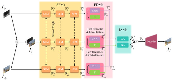 Given that the objective of IVIF is to produce a composite image containing detailed information about prominent objects in the scene, we introduce the TCTFusion approach, illustrated in Figure 3. TCTFusion comprises four essential components as follows: SFMs, FDMs, IAMs, and a decoder. Within this framework, the SFMs are crucial for extracting initial features from the source images. These modules focus on capturing shallow features, specifically , , and , ensuring that vital information is retained and integrated throughout the fusion process. Each SFM includes three convolutional layers with skip connections, where each layer consists of a 3 × 3 convolution, a Batch Normalization (BN) layer, and a GeLU activation function. Subsequently, , , and are individually processed by the FDM to extract local high-frequency complementary features and model long-range dependencies, resulting in , , and . To combine cross-modal, modality-specific local features and shared global features, the IAM merges and , producing high-frequency group fusion features and low-frequency group fusion features . Following this, channel concatenation is applied to to integrate the captured high-frequency and low-frequency information, resulting in . Finally, the combined feature set is fed into the decoder to reconstruct the fused image. As an end-to-end fusion model, the decoder directly outputs the final fused image, denoted as .