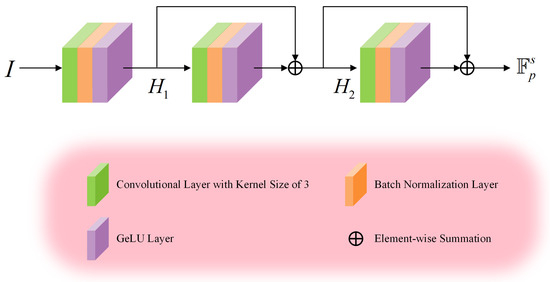 The SFM is engineered to efficiently capture shallow features from the input images, utilizing skip connections to enhance feature transmission and reduce information loss, as depicted in Figure 4. To clarify the SFM’s workflow, the following symbols are defined: represents the input images, specifically infrared, visible, and channel-concatenated images; denotes a convolution operation with a 3 × 3 kernel; BN stands for the batch normalization layer; GeLU refers to the Gaussian Error Linear Unit activation function; and represent the weight and bias parameters of the n convolutional layer, respectively; and denotes the intermediate output of the n layer. Consequently, and are defined as shown in Equation (1).