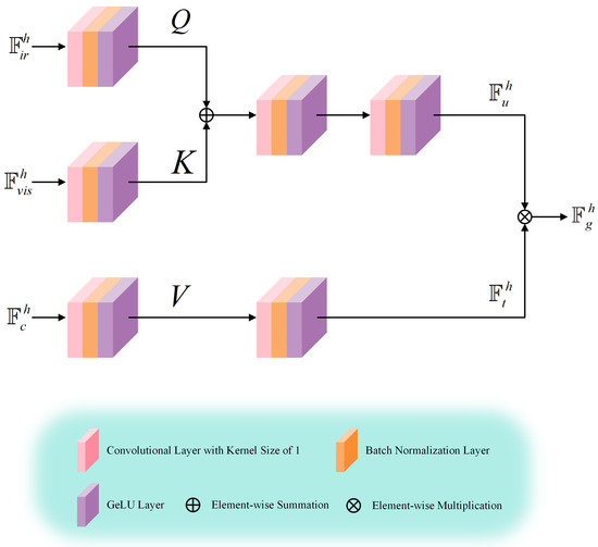 The IAM facilitates the merging of high-frequency and low-frequency features derived from the FDM through cross-modal information integration. IAM primarily consists of two parallel group attention mechanisms, each dedicated to managing high-frequency and low-frequency feature groups separately. The structure of the high-frequency group is depicted in Figure 6. Initially, convolution operations are applied to the high-frequency features of each modality to generate the queries (Q), keys (K), and values (V). Subsequently, Q and K are combined and processed through two consecutive convolution layers to effectively merge modality-specific characteristics. Simultaneously, V is subjected to a 1 × 1 convolution to preserve shared features. Finally, the cross-modal features and shared features are multiplied to produce the comprehensive fused features. This approach ensures that crucial shared features across modalities and modality-specific features within each modality are maintained, while redundant information is eliminated. The fusion mechanism is further explained in Equation (6).