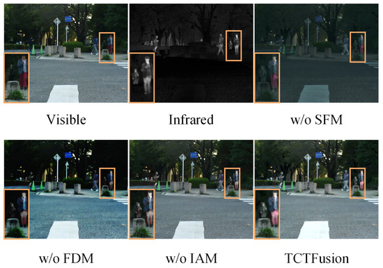 To assess the impact of each module and the design of the loss functions within the TCTFusion algorithm, we conducted two separate sets of ablation studies. The first set targeted module ablation, aiming to evaluate the specific contributions of the SFM, FDM, and IAM to the overall fusion performance. Following this, we performed loss function ablation experiments to investigate the effects of using only pixel loss or exclusively structural loss on the quality of the resulting fused images.