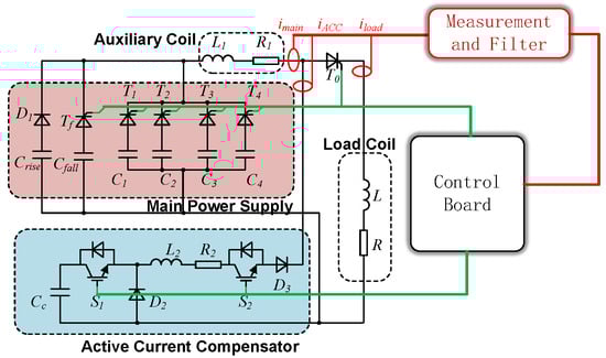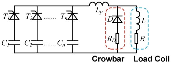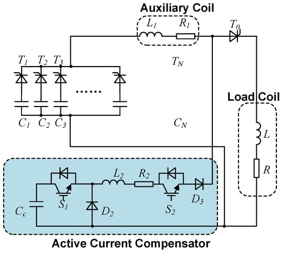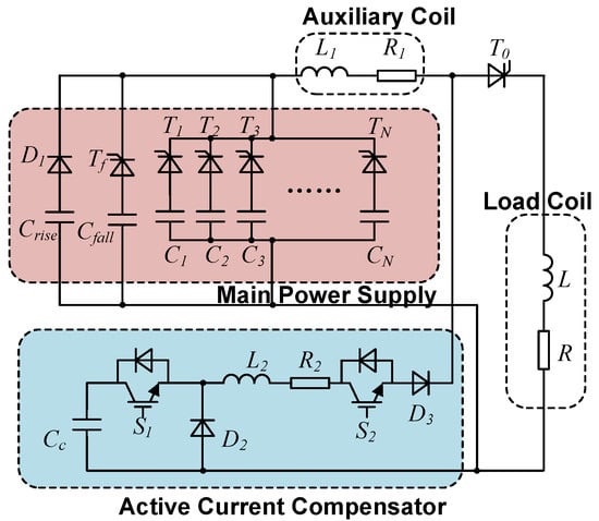 The topology of the power supply system is depicted in Figure 4, which is composed of a main power supply structure based on an optimized SFPFN, an ACC structure using IGBTs as switches, an auxiliary coil and the load coil. The main power supply structure is composed of a series of capacitors with different capacitance and voltage levels. Specifically, the of a small capacitance and a high initial voltage is used to generate a fast-rising current stage, a capacitor bank from to of a big capacitance and a low initial voltage are used to maintain the flat-top current stage, and the of a small capacitance and a high voltage is used to generate a fast-falling current stage. The ACC structure compensates for the current shortage during the platform stage of the load current and the regulating of the load current to minimize the ripple, and a PI controller is used to change the duty cycle of the ACC’s switch . An auxiliary coil is connected between the main power supply structure and load coil, which works as a voltage filter and shared part of the voltage to reduce the switching stress of the ACC’s switch. Moreover, it also determines the current ripple of the main power supply structure, which will be discussed in a later part of this section.