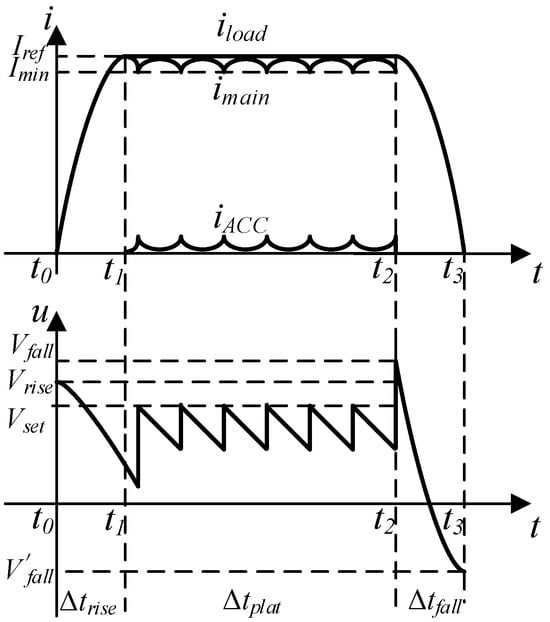 Figure 5 depicts the expected theoretical load current waveform and the output voltage waveform of the main power supply, which are divided into a rising stage, a flat-top stage and a falling stage. In Figure 5, is the load current, is the output current of the main power supply structure and is the output current of the ACC structure.