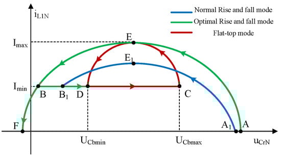 State trajectory analysis is a common analytical tool in the field of power electronics, particularly for studying the dynamic behavior and steady-state performance of nonlinear systems. Based on the state-space model, it integrates circuit topology and system parameters to describe power electronic circuits. For this topology, the current of the auxiliary coil L1 is chosen and normalized as the resonance current , and the voltage of the capacitors in the main power supply structure is chosen and normalized as the the resonance voltage . The state trajectory of the system can be illustrated as in Figure 6.