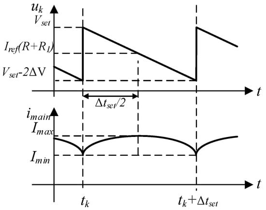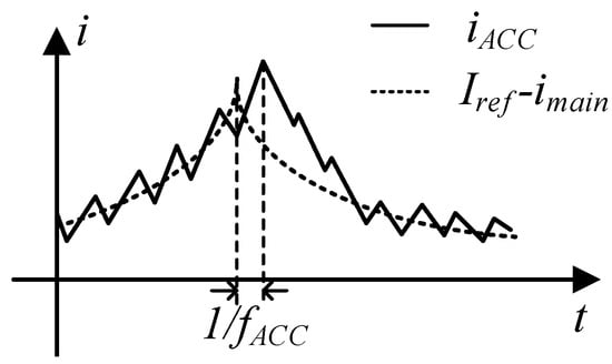 Assuming that the switching frequency of is , the theoretical maximum fluctuation of the current (also of ) happens when the output current of the main power supply structure reaches its minimum value, which is also the same time when the capacitor bank switches to a new capacitor. At this moment, the change rate of the will instantly change from a negative value to a positive value, and due to the control scheme based on the fixed switching frequency and the changeable duty cycle, the output current of the ACC will be one switching period later than the expected current that needs to be compensated for, i.e., . Figure 14 depicts the situation. It can be seen that the output current of the ACC will increase at its maximum change rate through nearly a whole switching period (because the change rate of also reaches its maximum value at this moment) right after the current sensor captures the peak value of . The maximum fluctuation of the load current can be calculated as