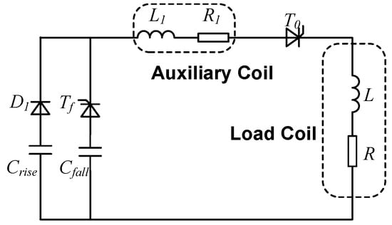 Most FPTMF topologies care little about this stage and choose a crowbar branch to let the load current drop slowly in an LR-damping process as in Figure 3. But in the proposed topology, an accelerated fall mode is introduced with the fall mode capacitor, and the equivalent circuit is shown as Figure 11. After the load current reaches the reference pulse-width, the PWM signal of will be turned off. After the output current of the ACC drops to 0, will be turned off and then will be turned on, and the falling stage capacitor with a small capacitance and a high voltage will be connected to the circuit. The thyristors of the capacitor bank will bear an inverse voltage and be shut down. After the voltage of drops until it is lower than the voltage of , a first-order series LCR circuit consisting of the rise mode capacitor Crise, the load coil L and R and the auxiliary coils and will be formed, so that the load current will rapidly drop to 0, which is from point E to point F in Figure 6.