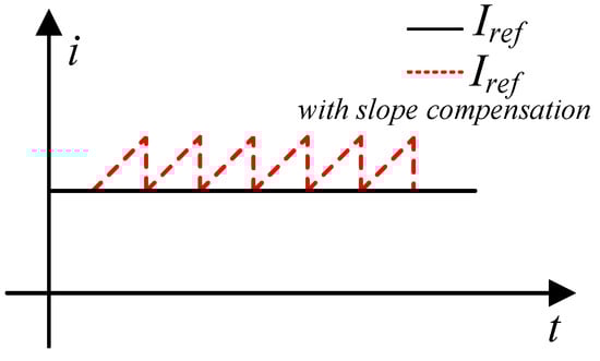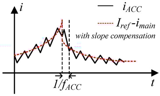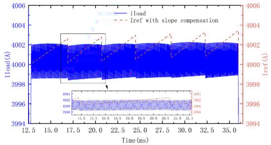 To address this problem, a scheme called slope compensation is introduced, which is a technique commonly used in the current-mode control of switching power converters to stabilize the system [13,14]. It is carried out by adding a saw-teeth wave to the reference value whose period is identical to the discharge interval of the capacitor bank but with one ACC switching cycle forward as depicted in Figure 16. At the capacitor switching moment, the waveform of the current is depicted in Figure 17. The current re-tracks the reference value in less than one ACC switching cycle, thus increasing the stability of the system.