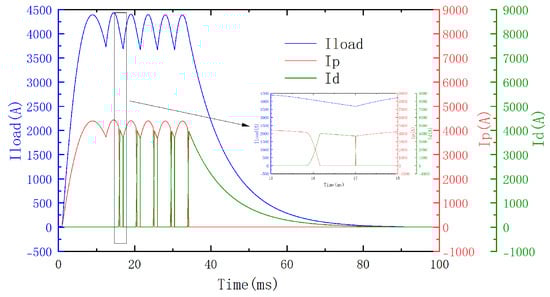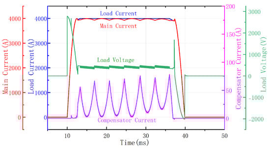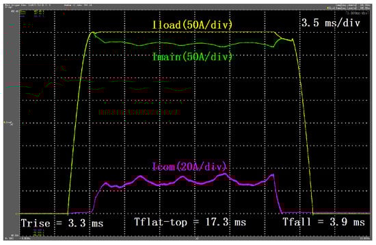 Figure 19 shows that the current rise time and the current fall time are both less than 4 ms, which is consistent with the theoretical result according to (2). Figure 19 also shows that the fluctuation of the output current of the main power supply structure is within 5%, i.e., 80 A, which is also consistent with the theoretical result according to (9).