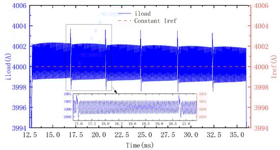 As a feed-forward loop of the capacitor bank voltage is introduced, the stability problem is improved, the load current now takes only one ACC switching cycle to resettle, the result is illustrated in Figure 21, in which the load current swings between 3998.5 A and 4002.5 A during each capacitor discharge cycle. But, as discussed in the Section 3, the current still fluctuates at the time point of the capacitor bank switching, making the total current ripple still not satisfying.