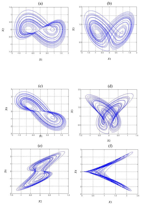 Figure 1 illustrates the two-dimensional phase diagrams of the modified Shimizu–Morioka system, which exhibit its chaotic dynamics.