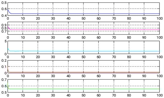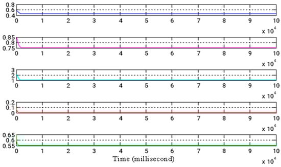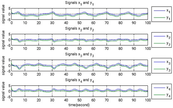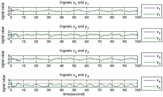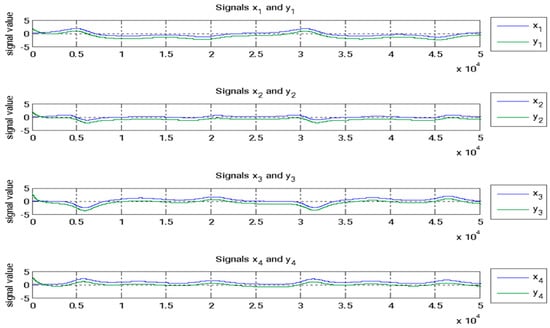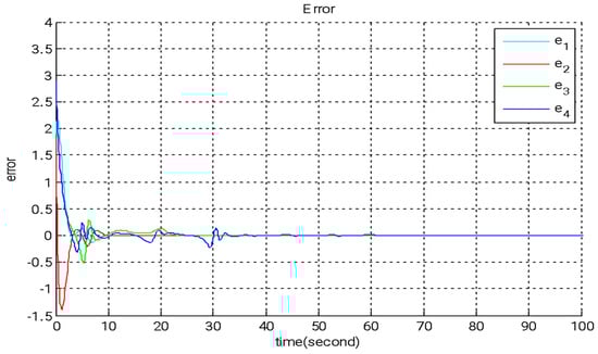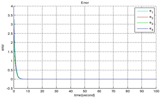 For the numerical simulation, the following parameter values are used: a = 0.45, b = 0.75, c = 1, d = 0.01, and r = 0.55. The starting conditions for both the master and slave systems are as follows: x1 = x2 = x3 = x4 = 0.1, y1 = −2, y2 = 2, y3 = 3, and y4 = −3. The initial conditions for the update rule are as follows: , and . These controllers guarantee synchronization between the two systems as time tends toward infinity, with the error function eventually converging to zero. The error function is expressed as follows: