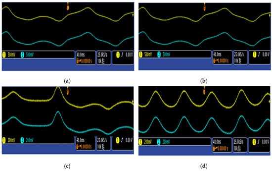 Actual oscilloscope images of synchronized waveforms for both the master and slave systems, captured using FPGA: (a) (b) (c) and (d)