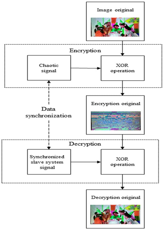 As we have established the synchronization of the new Shimizu–Morioka system in Section 4, we can now use the slave system to decrypt the image encrypted by the master system. The decryption process is illustrated in the flowchart in Figure 11.