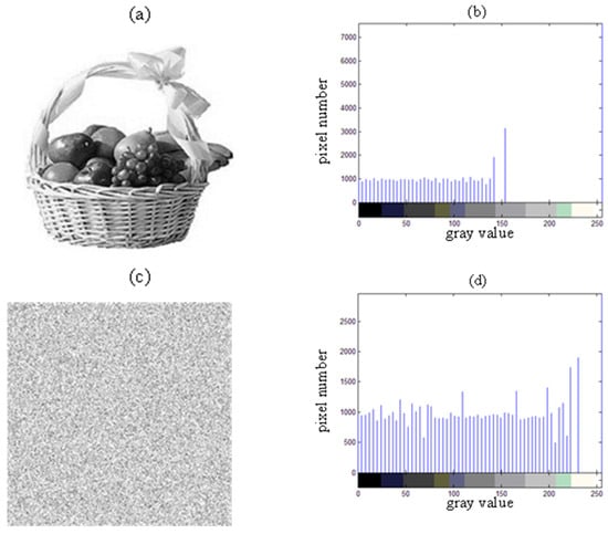 (a) The original gray image of Fruit; (b) the histogram of the original grayscale image of Fruit; (c) the grayscale image of Fruit after encryption; and (d) the histogram of the encrypted grayscale image of Fruit.