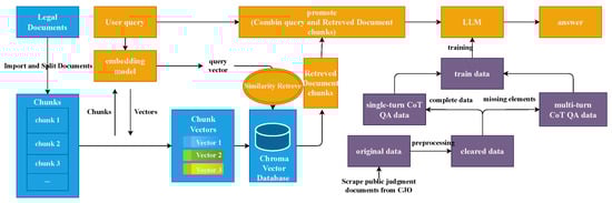 Legal question-answering system workflow. The blue module represents the construction of the retrieval database, the purple module represents LLM training, and the yellow module represents the inference module.