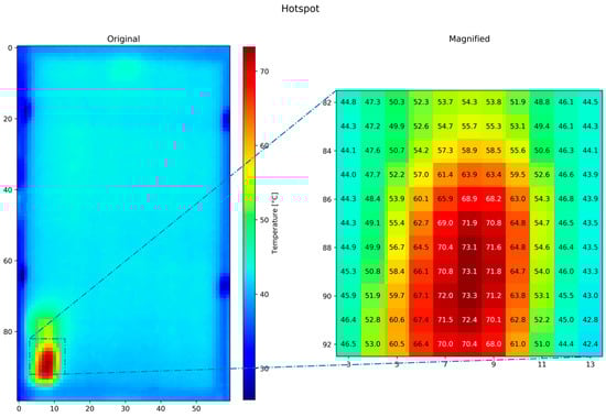 Solar PV panel labeled Hotspot effect: Original and magnified region of 2D radiometric datapoints—temperature intensity matrix [°C] (jet colormap as pseudo-color applied for visual depiction).
