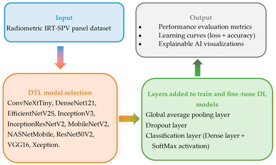 Pre-trained deep learning (DL) models, particularly when trained on ImageNet [38] datasets, present a powerful solution to these challenges, offering a robust framework for both binary classification (No-Anomaly vs. Anomaly) and multi-class classification (No-Anomaly vs. multiple fault categories) [39]. By leveraging pre-trained feature extractors from large-scale datasets like ImageNet [38], DL models significantly improve generalization capabilities, even when the training data for SPV faults are limited for diagnostic monitoring. In the paradigm of Deep Transfer Learning (DTL), the models can transfer the patterns learned from a wide range of images to specific tasks, such as the diagnosis of IRT images of SPV panels, enabling them to accurately detect faults with much smaller amounts of domain-specific data. Furthermore, DL models, such as VGG16 [40,41], eliminate the need for traditional feature engineering by automatically extracting relevant features from the IRT images. In addition to simplifying the feature selection process, DTL also allows for faster training and more accurate classification.