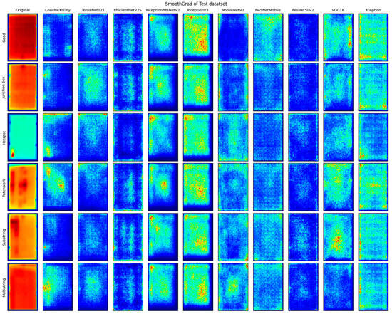 Explainable deep learning—SmoothGrad with Guided Backpropagation visualizations from the last convolutional layer for 6-class classification (jet colormap as pseudo-color applied for visual depiction). Red corresponds to higher activation values, blue to lower values.