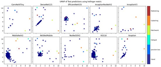 Embedding with UMAP (feature clustering) of test dataset predictions (Hellinger metric). Each data point is depicted as a star-shaped point. Kindly note that some points are overlapped.