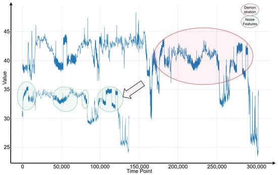Based on a comprehensive analysis of energy distribution characteristics and physical constraints, it can be determined that the high-frequency components primarily originate from noise interference rather than effective signal components reflecting the system’s true state. Notably, the signal segment near time point 200,000 exhibits a higher signal-to-noise ratio, demonstrating superior signal quality and lower noise levels, providing a reliable reference baseline for evaluating potential signal distortion introduced by denoising algorithms.
