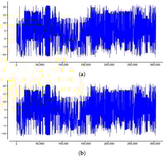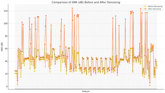 Figure 6 illustrates the SNR comparison across the entire dataset’s features, demonstrating consistent SNR enhancement after denoising. The yellow line represents the original signal’s SNR, which fluctuates between 20 and 60 dB across different features, while the red line shows the improved SNR post-denoising, reaching peaks of over 120 dB in some features. This substantial improvement in SNR, with an average increase of approximately 10 dB, quantitatively validates the effectiveness of the L-WPT denoising approach in enhancing signal quality while preserving essential information.