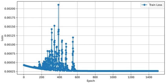 Based on the computational complexity analysis, L-WPT exhibits a dominant complexity of , where N denotes the sequence length, L represents the decomposition level, and K indicates the wavelet filter length. In contrast, RevIN only introduces an complexity, contributing minimally to the overall computational cost. As shown in Figure 7 and Figure 8 while the original L-WPT model demonstrates significant loss fluctuations (ranging from 0 to 14) and requires nearly 3000 epochs to converge, the RevIN-enhanced version achieves remarkable stability with loss values confined to a much smaller range (0 to 0.002) and reaches convergence within 600 epochs. This substantial improvement in training dynamics—characterized by both faster convergence and enhanced stability—validates that RevIN effectively accelerates model training while maintaining the same computational efficiency class. Furthermore, the normalized loss values reflect better gradient flow during training, enabling more efficient parameter updates without introducing significant computational overhead.