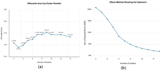 Subsequently, Silhouette Score (Figure 9a) and Elbow Method (Figure 9b) were applied to determine the optimal number of clusters, K. The Elbow Method evaluates the clustering performance by calculating the sum of squared errors (SSE) for different K values. Our results indicated a clear “elbow” at , where the reduction in SSE slows significantly, suggesting that further increases in the number of clusters offer only marginal improvements in clustering performance.