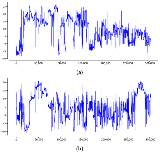 Through Frequency Spectrum Analysis and Power Spectral Density (PSD) analysis, significant anomalous fluctuations were identified in the data (Figure 2, red region). From a physical perspective, oil temperature, being influenced by system thermal inertia and heat transfer characteristics, should not exhibit such high-frequency variations. The spectral analysis provided evidence from both energy distribution and physical characteristics perspectives. Regarding energy distribution, PSD (Figure 3a) and spectral analysis (Figure 3b) results indicate that signal energy is predominantly concentrated in the low-frequency region below 0.001 Hz, with power density reaching 9000. At higher frequencies, power density attenuates rapidly to negligible levels. This energy distribution pattern suggests that high-frequency components contribute minimally to the overall signal energy compared to low-frequency components. From a physical characteristics perspective, considering that the data represents ship lubricating oil temperature variations, its dynamic behavior is primarily governed by system thermal inertia and heat transfer processes. According to thermodynamic principles, lubricating system temperature variations typically manifest as gradual transition processes. High-frequency oscillations (periods less than 16.7 h) are inconsistent with the fundamental thermodynamic behavior characteristics of the lubrication system.