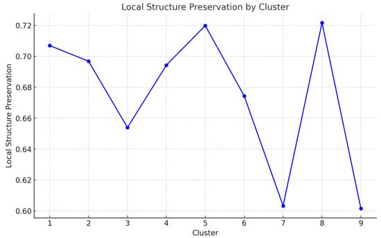 Figure 13 demonstrates the Local Connectivity Retention (LCR) analysis across nine clusters after UMAP dimensionality reduction. The results show varying degrees of local structure preservation, with LCR values ranging from 0.60 to 0.72. Specifically, clusters 5 and 8 achieve the highest preservation rates of approximately 0.72, while cluster 7 shows the lowest at 0.60. The threshold of 0.60 is significant in two aspects: mathematically, it indicates that more than 60% of the local neighborhood relationships from the original high-dimensional space are preserved in the reduced space; physically, for ship engine data, this level of preservation ensures that similar operating states remain grouped together, maintaining the underlying system dynamics representation. With all clusters exceeding this threshold, UMAP successfully balances dimensionality reduction while preserving sufficient local structure for reliable pattern recognition in the ship’s operational data.