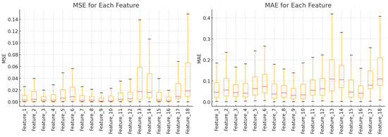 As shown in Figure 14, the box-plot analysis of MSE and MAE distributions across 18 features reveals significant performance variations. The results indicate that the majority of features achieve MSE values within [0, 0.02], demonstrating the model’s robust predictive capability, and their corresponding MAE values were predominantly distributed between [0.05, 0.1].