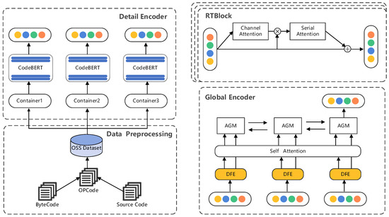 As shown in Figure 1, RTMS employs a layered architecture, utilizing multiple CodeBERT models in parallel for local feature extraction, which can expand the range of scalable input and then rely on a bidirectional AGM network to achieve feature extraction at the global level. RTMS first standardizes the collected smart contracts, whether in the form of Solidity or bytecode, into opcode form. Compared to decompiling bytecode back into Solidity code, this method not only fully expresses the code logic with a more concise amount of text but also retains the original information of the bytecode to the greatest extent possible. Subsequently, the sequence of opcodes undergoes simplification processing. Considering that the EVM has over 140 instructions, some of which are logically weak and infrequently used, leading to scattered features. By merging these instructions, feature recognition can be enhanced, allowing the CodeBERT model to more effectively understand the semantics of the code. Next, the data are sliced and divided into several pieces according to a length of 512 tokens, which are then placed into containers. The data in the containers are input into the CodeBERT model for feature extraction, and by accumulating the outputs of the last four hidden layers, local feature vectors are obtained. These feature vectors are then input into the DFE module to map to the hidden layers, and finally, a bidirectional AGM network is used to integrate local features, extract global features, and complete preliminary classification. The preliminary classification results are input into the RTBlock module to extract correlations and refine the classification results. By integrating vulnerability correlations, the accuracy and stability of the classification results can be improved.