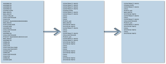 - Remove consecutively appearing instructions. There are many instances of the same instruction appearing consecutively in the opcodes. For example, when the ADDRESS instruction (to get the current account address) appears consecutively, it represents only one logic. In such cases, the repeated instructions should be deleted to reduce the weight of that instruction.