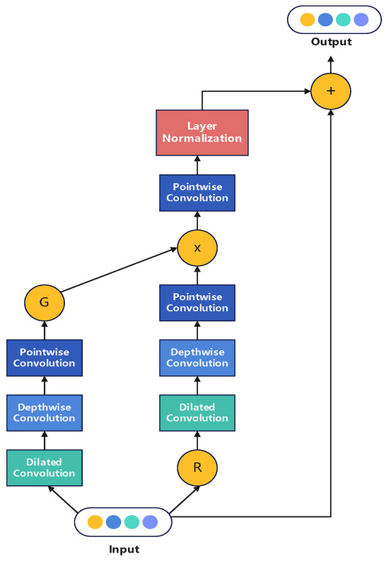 The DFE (detail future encoder) module, as a crucial component of the RTMS architecture, is depicted in Figure 4. It utilizes a deep separable convolution structure that integrates dilated convolutions, depthwise convolutions, and pointwise convolutions, along with gating mechanisms, to achieve bidirectional extraction and fusion of local semantic features. This module enhances feature representation by adjusting the features of the reverse input based on the forward input and summing them with the original forward input.