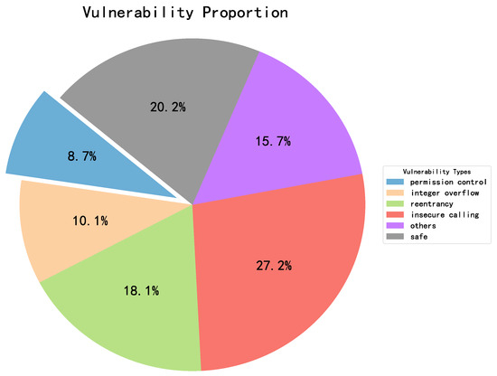 To avoid overfitting, the dataset is divided into training, testing, and validation sets in an 8:1:1 ratio. This tool has marked out 38 detailed types of vulnerabilities. To further reduce data imbalance, similar vulnerabilities among the 38 are merged. The final dataset includes vulnerability types such as access control, integer overflow, re-entrancy, and insecure calls. The number of samples in each category of the dataset is shown in Figure 7.