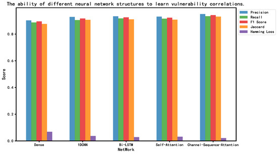 To demonstrate the ability of different deep learning methods to learn vulnerability correlations, Table 5 and Figure 8 present a performance comparison of RTNetBlock layer using fully connected layers, one-dimensional CNNs, bidirectional LSTMs, self-attention mechanisms, and channel-sequence attention. The performance of extracting correlations between vulnerabilities is measured across five dimensions: precision, recall, F1 score, Jaccard coefficient, and Hamming loss.