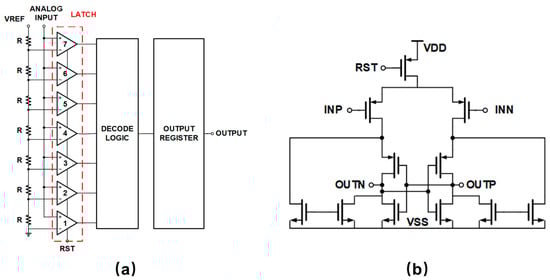 (a) Architecture schematic diagram of a 3-bit FLASH ADC; (b) Architecture schematic diagram of a Strong-arm Latch Comparator.