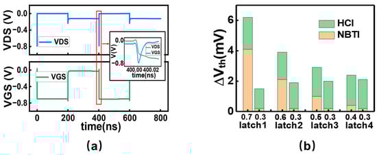 Figure 2a depicts the gate–source voltage and drain–source voltage of the input transistor in the comparator under a reset signal with a 400 ns period and a duty cycle of fifty percent. The stress waveform is primarily biased towards NBTI stress, occupying approximately 50% of the entire cycle. Its magnitude is determined by the PMOS gate voltage, with a smaller gate voltage resulting in a larger voltage difference between it and the source terminal during reset (relatively high), thus increasing NBTI stress. Additionally, the waveform includes HCI stress bias, as illustrated in the inset of Figure 2a, introducing high-current pulses with a very short duration, only in the picosecond range, but with significant current magnitude, making it non-negligible. These two effects are major contributors to aging, leading to significant threshold voltage shifts in transistors as operating time and temperature increase. Therefore, under operational conditions, the input transistor is subjected to the long-term effects of these two aging phenomena. It is necessary to further predict the threshold voltage shift caused by this stress and estimate the influence weights of these two stresses. Subsequently, circuit improvements can be made based on the predictions.