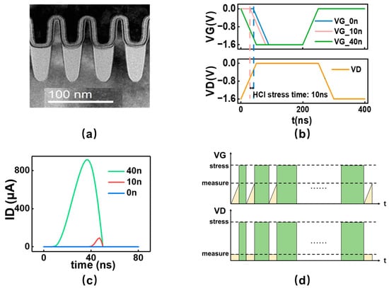 (a) The TEM of FinFET in the channel direction; (b) Three sets of AC stress waveforms with varying proportions of HCI; (c) The current magnitudes and durations for the HCI stress stage in the three AC stresses; (d) Illustration of the measure–stress–measure (MSM) waveforms.