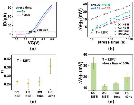 (a) The initial ID–VG curve of the device as well as the ID–VG curve after aging under NBTI stress for 1000 s; (b) The threshold voltage degradation curves of the device under four different stresses and the time power-law exponent n; (c) The average time power-law exponent n and its variation range for device aging under each stress; (d) The average threshold voltage shift and its variation range for device aging under each stress.