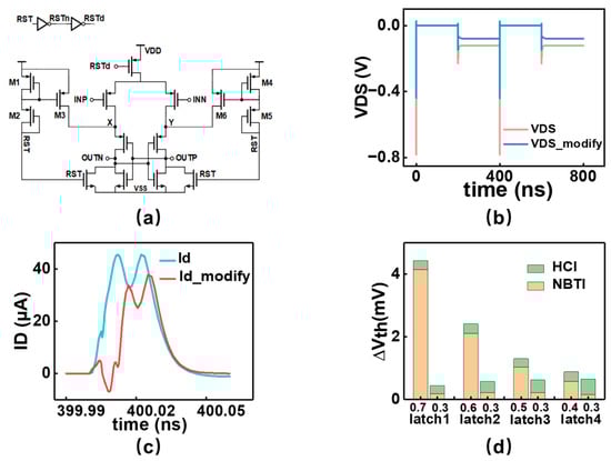 (a) A modified strong-arm latch comparator structure with a pre-charging method; (b) The comparison of source–drain voltage of input transistor before and after improvement; (c) The comparison of current pulses before and after the improvement in the comparator’s comparison stage; (d) Under conditions of operation at 125 degrees Celsius for ten years, the threshold voltage offset of the improved comparator’s input transistors.