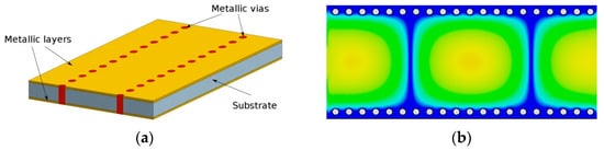 The structure of the substrate-integrated waveguide (SIW) transmission line is depicted in Figure 1a [4]. The SIW transmission line comprises a top metal layer, a ground layer, and a middle substrate layer. There are two rows of metallic vias along the line that facilitate the transmission of signals within them. The SIW line supports mode exclusively at the operating frequency indicated in Figure 1b.