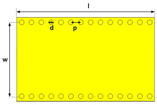 The essential design parameters of a substrate-integrated waveguide (SIW) transmission line are shown in Figure 2. In the figure, w and l represent the width and length of the SIW, respectively. The parameters for the vias are d and p, which denote the diameter of the via and the distance between two adjacent vias. It is important for the values of d and p to satisfy Equations (1)–(3) in order to minimize loss.