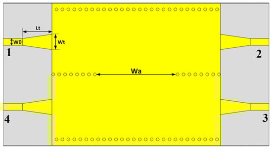 The simple SIW directional coupler features a single-aperture design [2]. Figure 4 illustrates the single-aperture SIW coupler. In this type of coupler, the critical parameter is the width of the aperture , as it influences the power distribution between the output ports. Tappers are used to connect transmission lines to the SIW. By incorporating tappers, the bandwidth of the circuit increases. The key parameters of the tapper include the width of the tapper , the width of the 50-ohm transmission line , and the length of the tapper .
