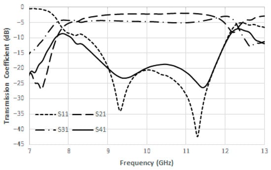 The simulated S-parameters of the conventional coupler are illustrated in Figure 5, with the results obtained from the CST simulator. As shown in the figure, the insertion loss of the designed coupler is approximately −3 dB, while the is about −5 dB, within the frequency range of 8.5 GHz to 11.5 GHz. Within this band, the is smaller than −10 dB, and the isolation is less than −15 dB. At a frequency of 10 GHz, the S-parameters are measured at −20 dB, −2.2 dB, −4.6 dB, and −19 dB, respectively.